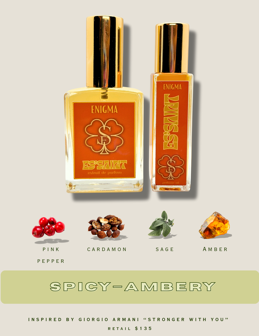Enigma is vanilla made masculine—woody, spicy, and smokey with pink pepper in the background.