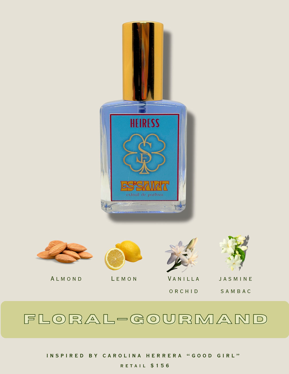 Heiress has sweet, nutty, floral opening notes that dries down to a warm, slightly creamy gourmand for a deeper vibe.