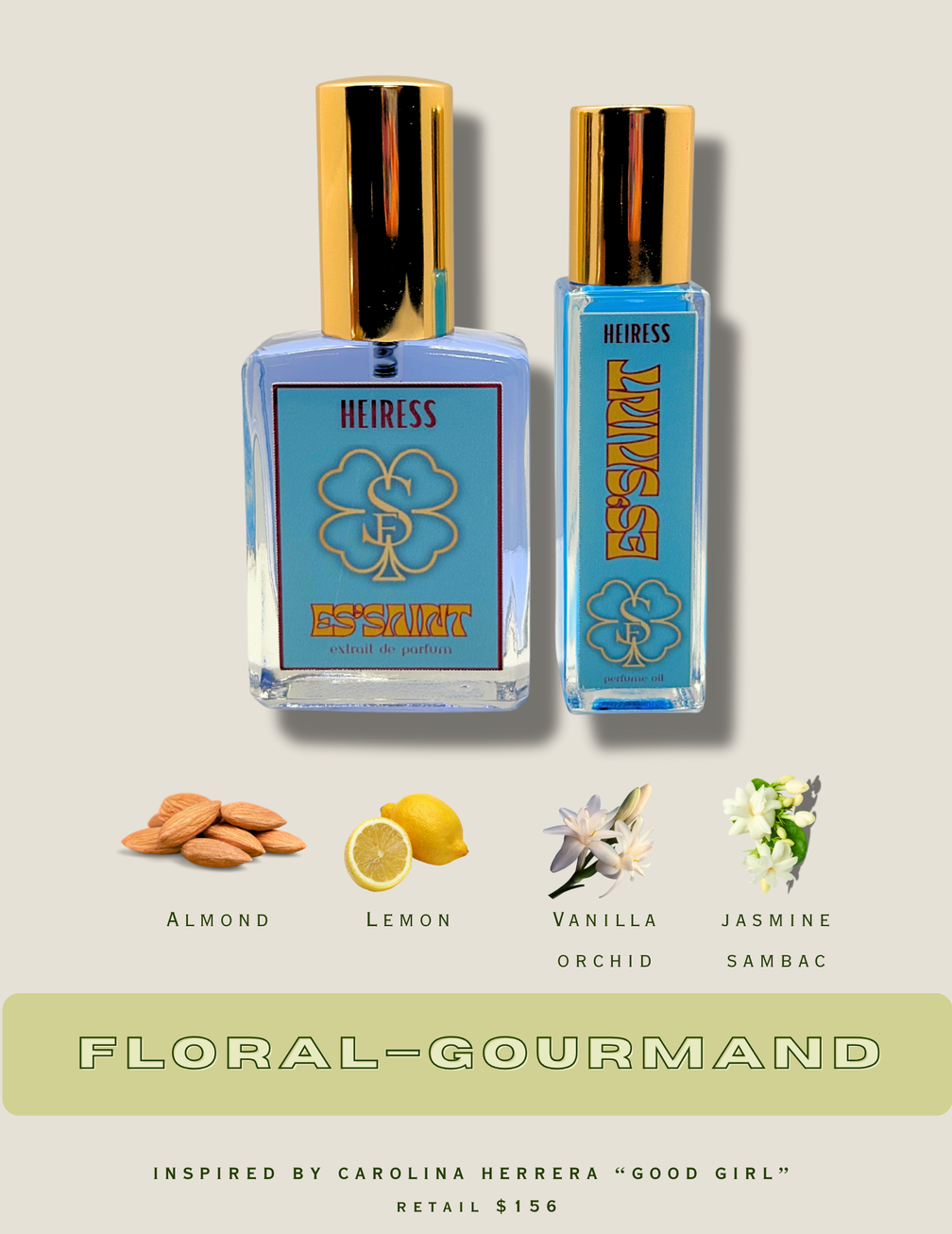 Heiress has sweet, nutty, floral opening notes that dries down to a warm, slightly creamy gourmand for a deeper vibe.